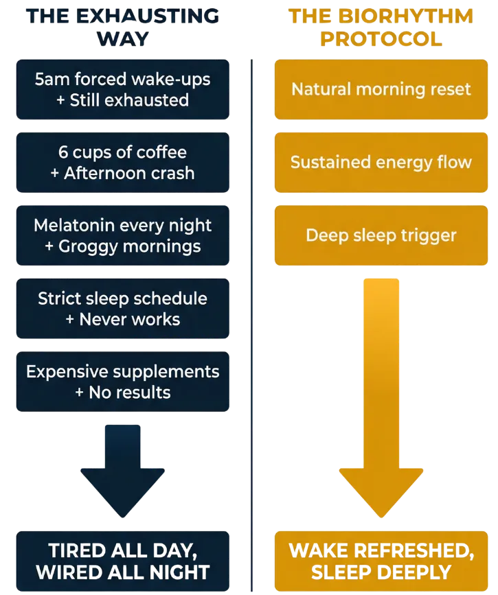 The key difference is our TRIAx System and 21-Day Reset framework. Traditional methods rely on supplements, willpower, and complicated protocols. Our system works with your body's natural timing ability to synchronize three hidden clocks and create lasting energy. Plus, you can start seeing results in just 3-4 days, making it practical for busy people. We've worked with thousands of people to refine this system, ensuring it works for everyone.